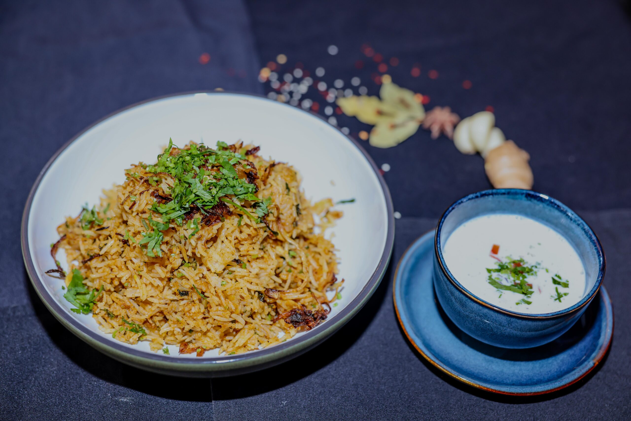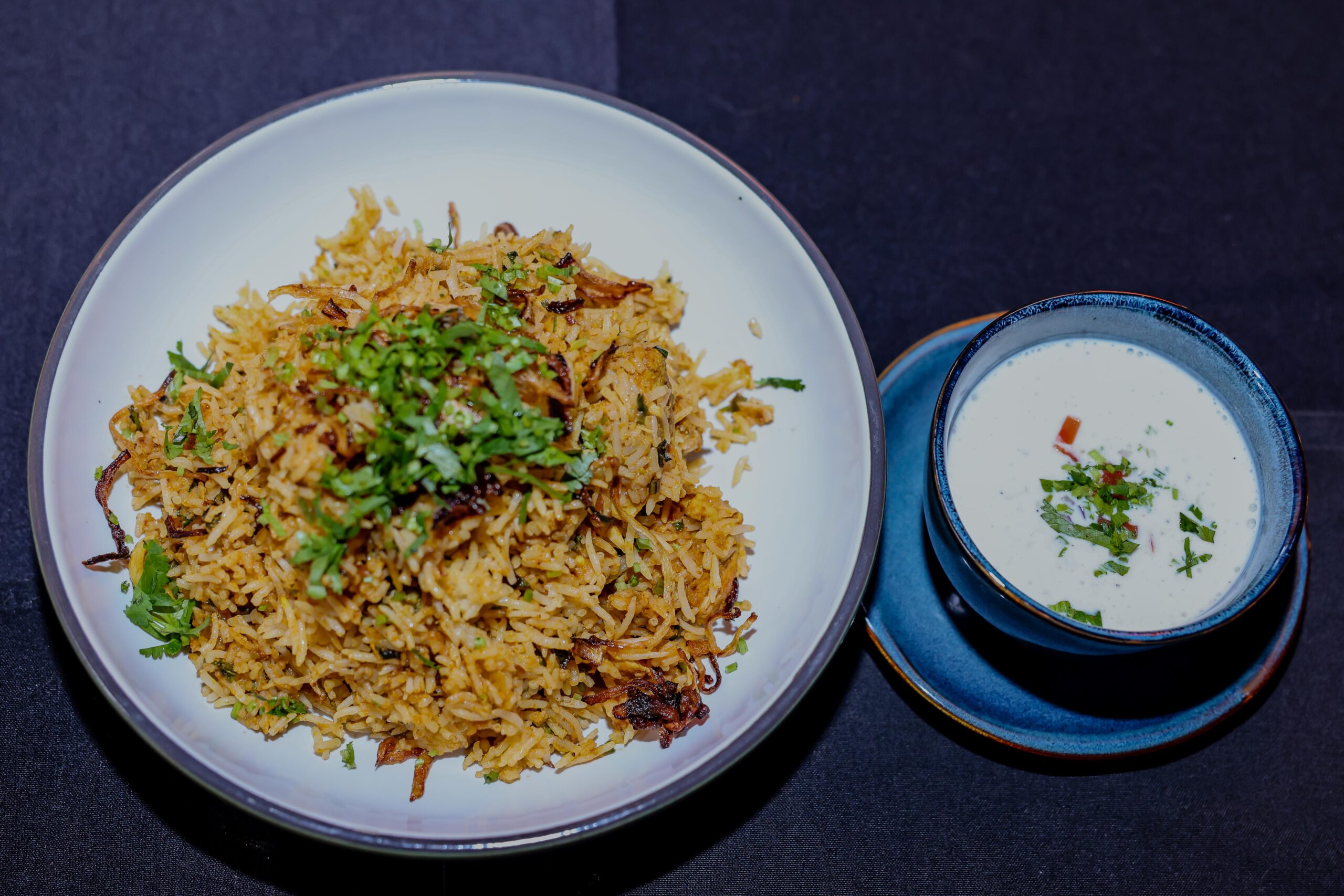 Tender pieces of marinated chicken slow-cooked with long-grain basmati rice, infused with warm Indian spices, toasted nuts, sweet raisins, and fragrant herbs.
